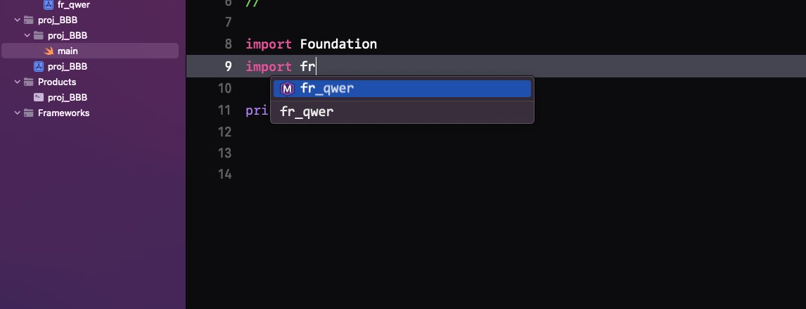 -> 현재 프레임의 Xcodeproj 추가 -> fr_qwer.xcodeproj
