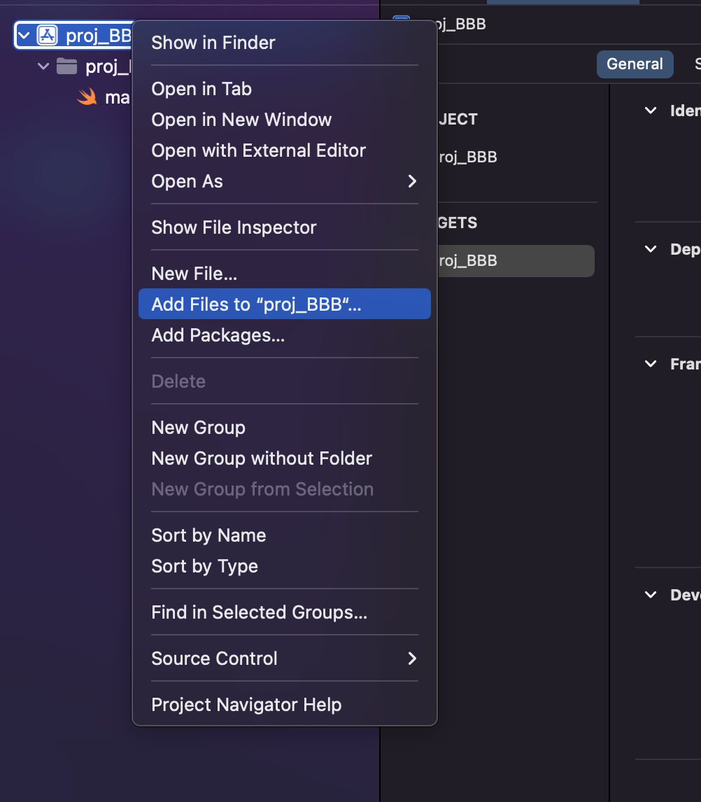 프로젝트 Target 후 마우스 우클릭 -> Add Files to "BBB ''''클릭
