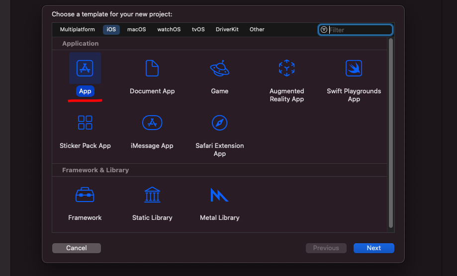 iOS 부분에 App 부분을 누르고 Next!