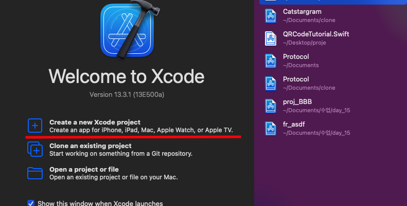 1. Xcode 실행하고 Create a new Xcode project 클릭 후 프로젝트 생성