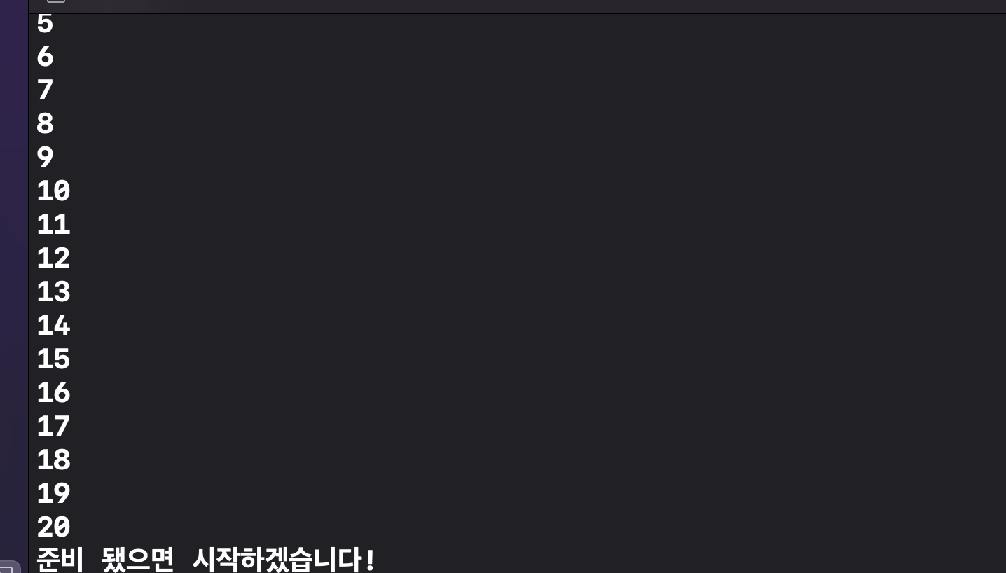 예를 들면 우리는 1부터 20까지 카운트한 다음 마지막에 "준비됐으면 시작하겠습니다!" 라는 텍스트를 출력하려고 합니다